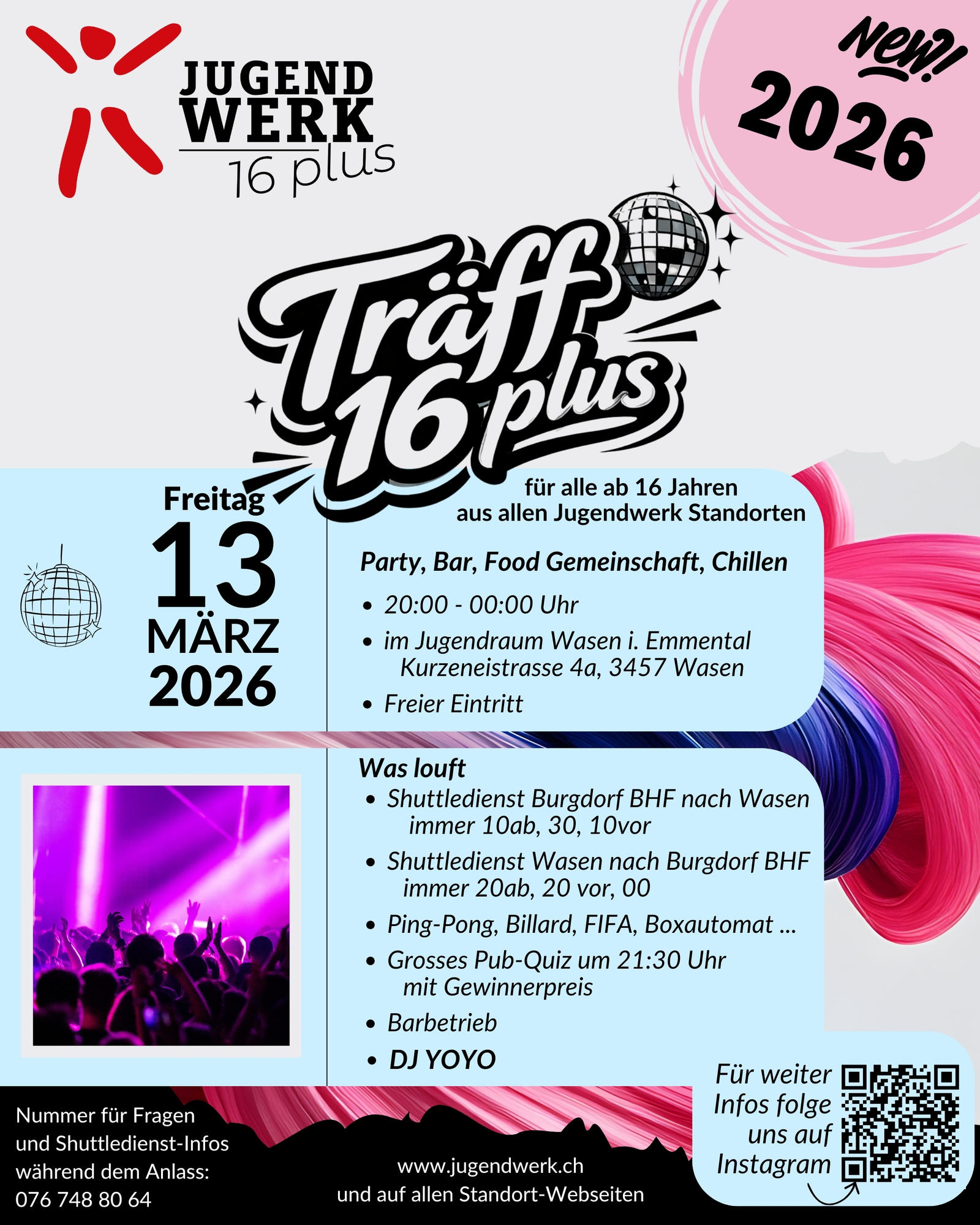 Das Jugendwerk gestaltet Standortübergreifend, zusammen mit einem Team aus freiwilligen jungen Erwachsenen, Angebote ab 16 Jahren. Im Zentrum von 16plus stehen Gemeinschaft, Begegnung und das gemeinsame Erleben von Freizeit. Die Angebote schaffen Raum für abwechslungsreiche Aktivitäten, spannende Erfahrungen und besondere Momente, die in Erinnerung bleiben.